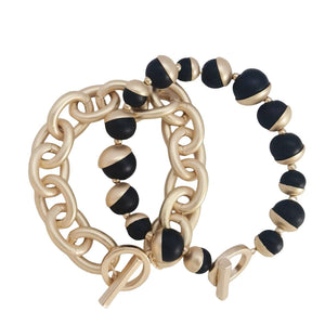 Black Wood and Gold Link Beaded Set of 2 Stretch Bracelets