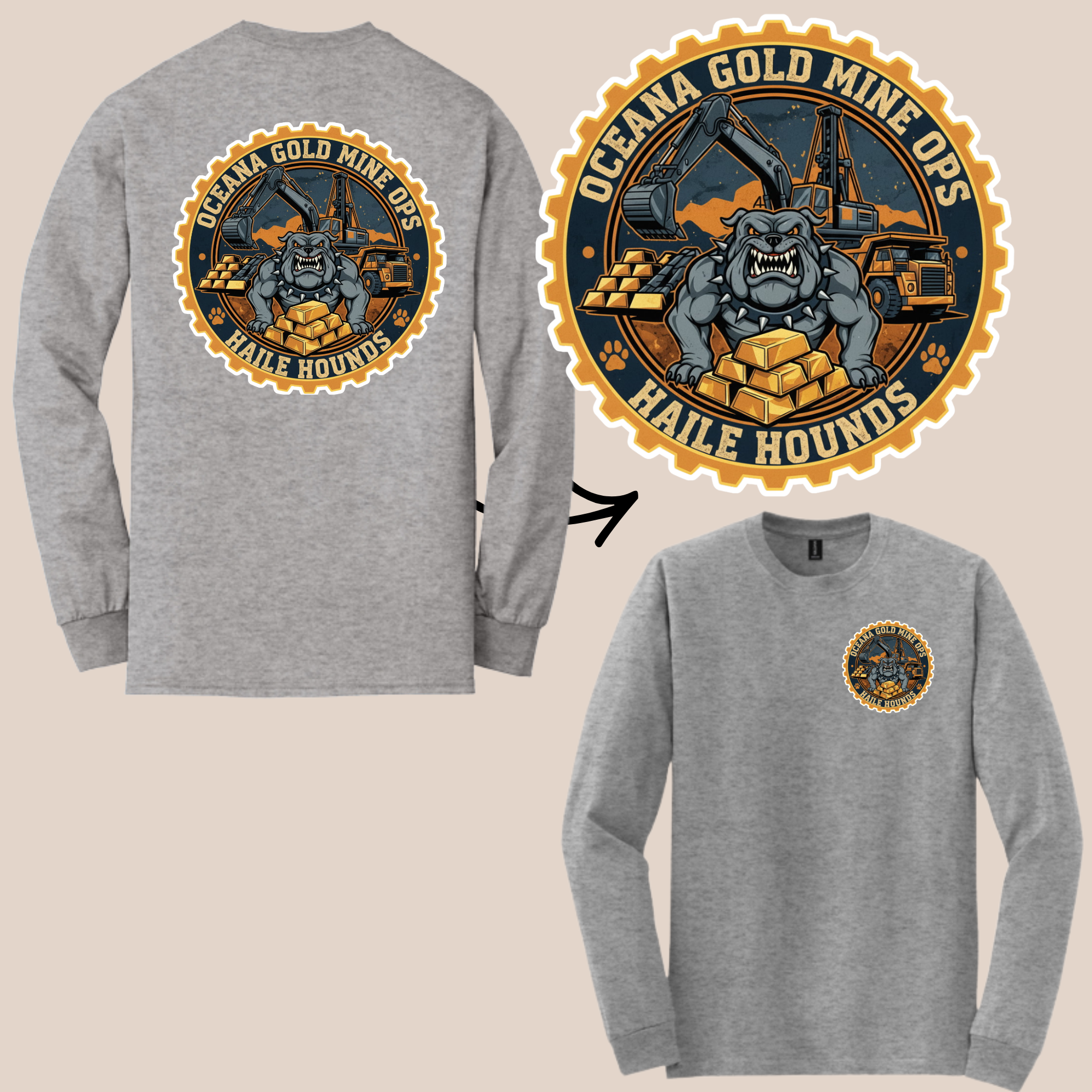 Stay warm and represent the Haile Hounds with this long sleeve tee featuring the bold Oceana Gold Mine Ops – Haile Hounds graphic. The striking design highlights the Haile Hounds mascot alongside gold bars and heavy equipment, symbolizing strength, pride, and teamwork at the mine.