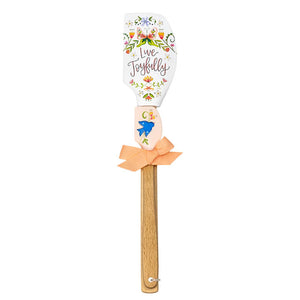 Large and small paired silicone spatulas featuring sweet sentiments. Large spatulas measure 2.5" x 12.75" with a measuring table on the back. Small spatulas measure 1.25" x 8.25". Both are heat resistant to 500 degrees F, stain-proof and dishwasher safe.