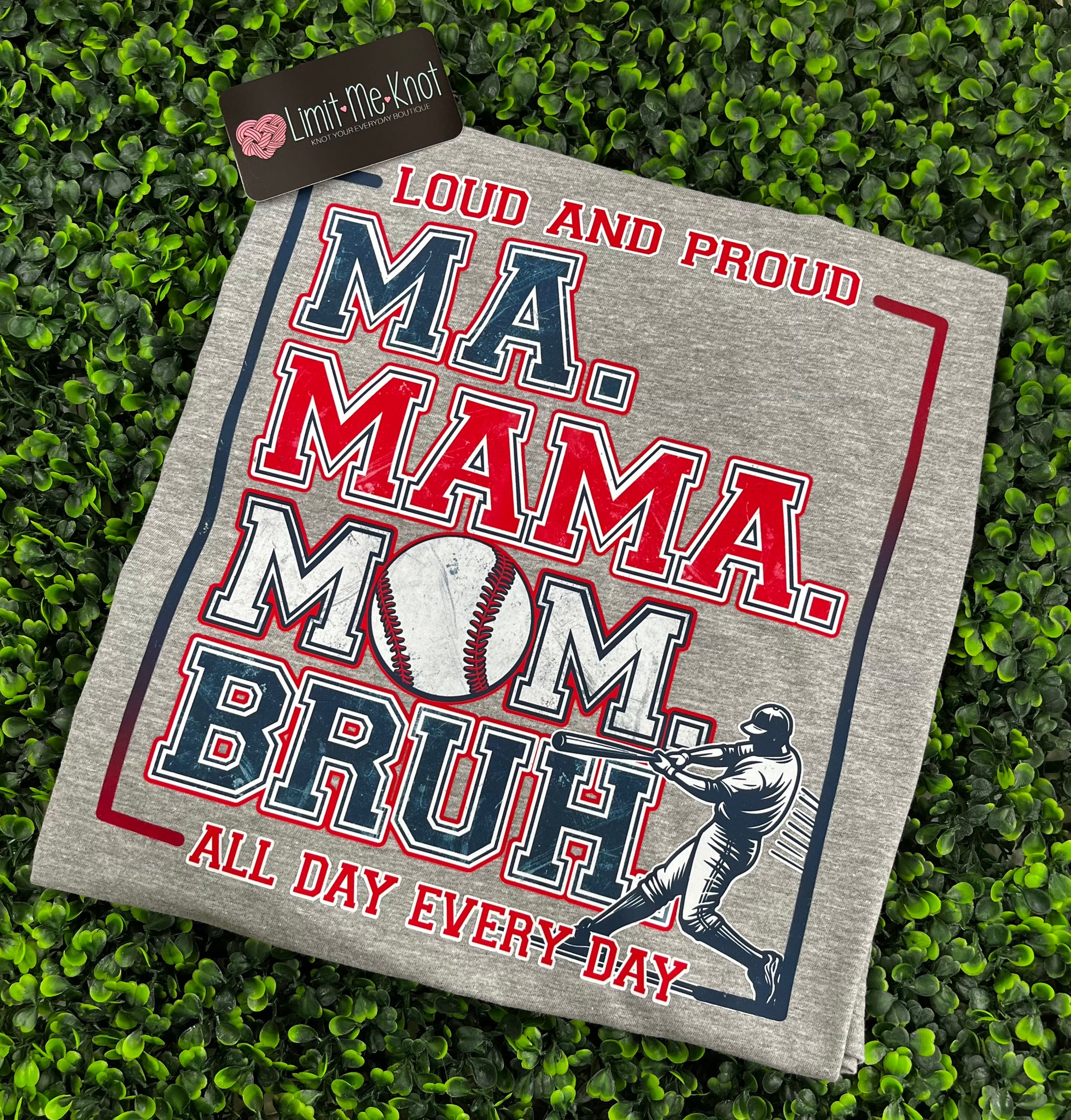 Show off your baseball mama pride in style with this bold and sporty graphic tee! ⚾❤️ The Loud and Proud Mama Mom Bruh design is perfect for cheering from the stands, celebrating game day wins, or repping your favorite player all season long. Featuring a classic varsity-style font, a vintage baseball graphic, and a fun playful vibe, this shirt is made for moms who bring the energy to every inning.