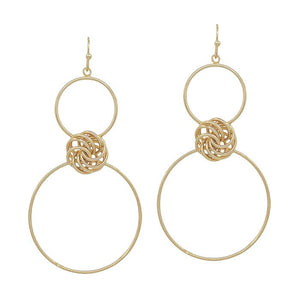 These elegant gold earrings feature a double circle design with a knot accent, measuring 2 inches in length. Crafted with expert precision, these earrings are a perfect addition to any outfit. Elevate your style with these versatile and sophisticated earrings.