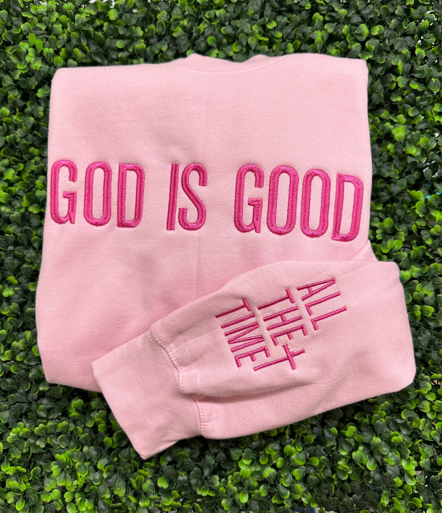 This soft, relaxed-fit crewneck sweatshirt isn’t just comfy — it’s meaningful. With beautifully embroidered lettering that reads “God Is Good All The Time” across the chest and a sweet little cross detail on the sleeve, this piece is a gentle reminder of His goodness wherever you go.