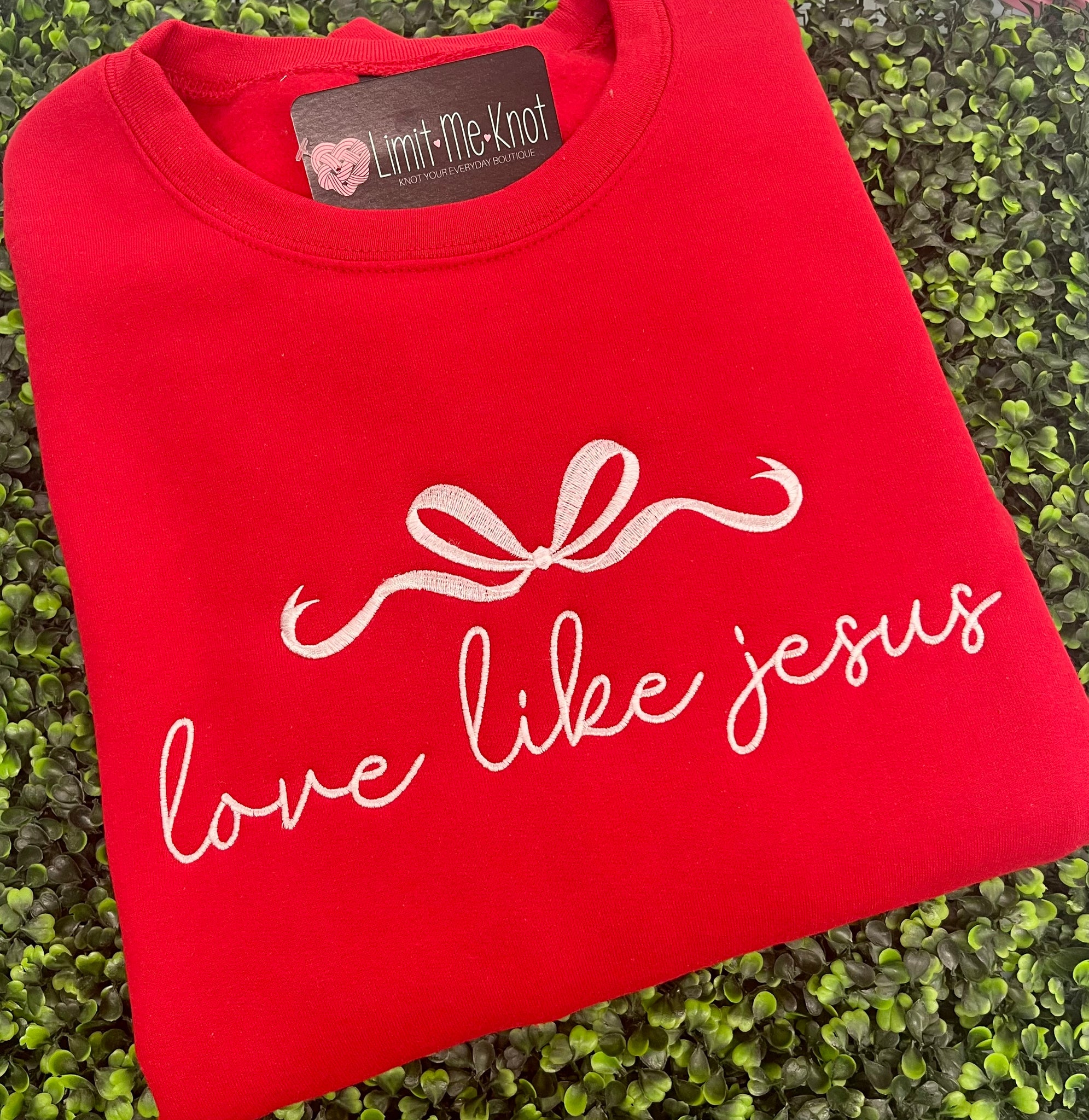 Our Love Like Jesus design features crisp white embroidery topped with a sweet bow detail, stitched on a bold red base for the perfect mix of faith, femininity, and everyday wear.