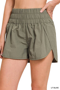 Wear the In The Wind Shorts for a breezy workout session. These windbreaker running shorts feature a back waist mesh pocket for your essentials and a smocked waistband for a comfortable fit. Available in plus sizes, these shorts are perfect for the beach or gym.