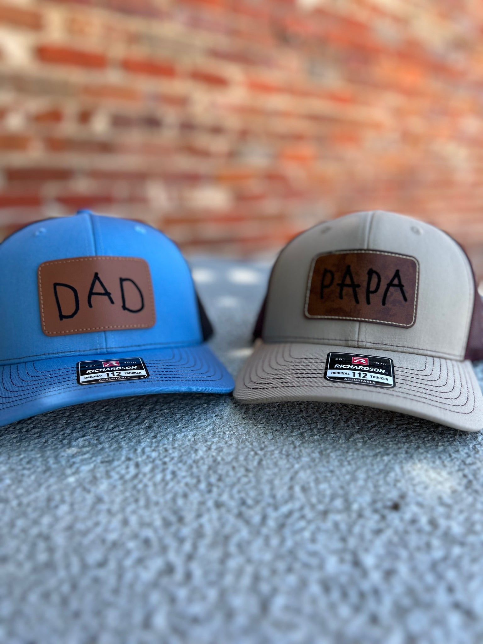 Add a personal touch with our Custom Title Leather Patch Hat! Featuring a custom engraved leather patch, this hat is perfect for Father's Day and birthdays. Have your child's handwriting added for a one-of-a-kind gift. Come by or send in their writing - we'll add it to the hat! ((If no handwriting is submitted we will pick a standard font to add to the hat))