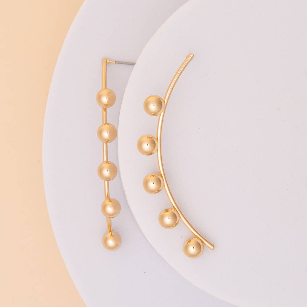 Measurements: Height: 2.4" · Width: 0.2" Key Features: These architectural-inspired earrings feature a sleek vertical arch adorned with polished ball beading for a modern geometric edge. Offered in both radiant yellow gold-dipped and refined silver-dipped finishes, they balance structure with fluidity—creating an elegant linear silhouette that flatters any look.