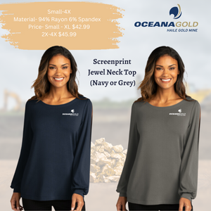 This Women's Jewel Neck Top is stylish and comfortable. Crafted with 94% Rayon and 6% Spandex, it is designed for superior fit. It also features an Oceana Gold Logo for an enhanced aesthetic. Optimal for everyday wear, this versatile top is sure to become one of your favorite pieces.